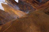 De persoon loopt hier de berg op en geeft een mooie schaal hoe groots dit landschap is.