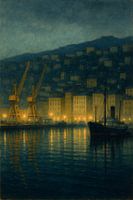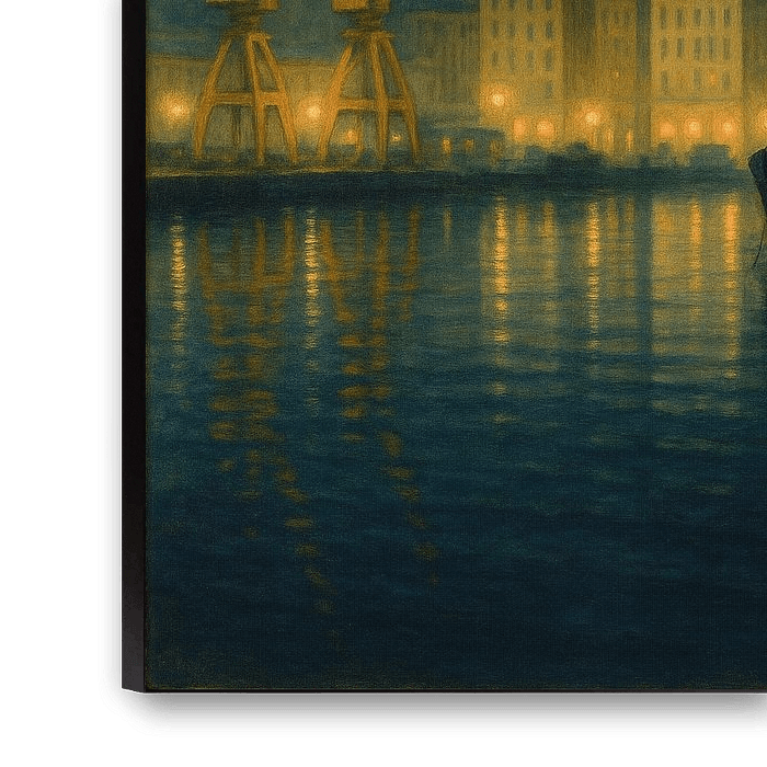 De stilte van de compositie is krachtig. Er zijn geen werknemers, geen beweging, geen lawaai - alleen het gefluister van het water en het zachte gezoem van elektrisch licht dat door de mist wordt verspreid. Dit is het soort melancholische stilte dat Hopper's nalatenschap definieert, maar dan getransponeerd naar het werkende hart van de Italiaanse Ligurische kust, waar licht, metaal en zee een nocturne van reflectie en uithoudingsvermogen uitvoeren.