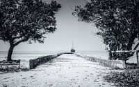 Een verlaten pier op het eiland met een ouderwetse boot op de achtergrond.