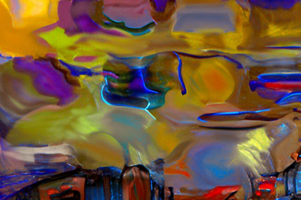 Een dynamische explosie van heldere kleuren die vervagen tot abstracte vormen. Het doet denken aan een caleidoscoop van vloeiende, bijna vloeibare emoties en dromen.