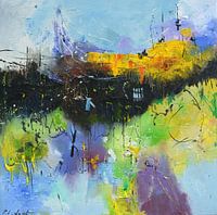 Levendige kleuren en dynamische streken creëren een abstracte scène die lijkt op een landschap. Gele en oranje tinten domineren het bovenste deel, wat doet denken aan een zonsondergang of zonsopgang, terwijl het onderste deel van de scène een mix is van groen en blauw, mogelijk een weerspiegeling van water of grasland.
