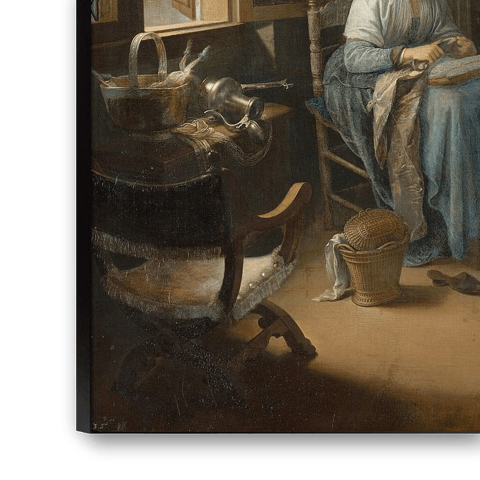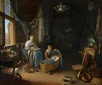 Een jonge moeder zit bij het raam met haar borduurwerk. Naast haar knielt een dienstmeisje naast de wieg. Het is geschilderd door Gerrit Dou, de voorvader van de Leidse 'fijnschilders', oftewel fijnschilders. Hij werkte met zo'n precisie, dat je de individuele penseelstreken nauwelijks kunt zien.