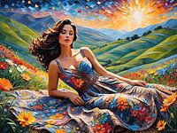 Breng de vreugde van een stralende zomerdag naar je huis met dit prachtige abstracte landschapportret. In dit schilderij ligt een vrouw ontspannen tussen bloeiende bloemen, gehuld in een speelse bloemenjurk. De zon schijnt warm over het tafereel en straalt een gevoel van pure…