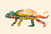 Een fascinerende kameleon die de kleuren en vormen van de natuur in zich draagt, trekt ieders aandacht. De levendige landschappen binnenin het dier stralen avontuur en diversiteit uit. Dit kunstwerk geeft een uitnodigende, inspirerende sfeer aan een woonkamer of creatieve werkruimte en stimuleert de verbeelding.
