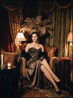 De houding is open, maar niet uitnodigend. De benen zijn gekruist, niet uit koketterie, maar als een vanzelfsprekendheid. Haar handen rusten beheerst op de armleuningen - geen…