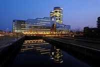Op de voorgrond het complex dat al in het begin van de jaren tachtig is gebouwd. Daarachter zie je het Rabobank Bestuurscentrum of de Rabotoren (in de volksmond ook wel de Verrekijker genoemd). Het is met zijn 105 meter het hoogste kantoorgebouw van de stad. De hoofdingang ligt aan de Croeselaan. Op deze foto kijk je tegen de zijkant aan, die straat heet Mineurslaan / Montageweg.