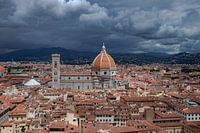 De kathedraal van Florence, Cattedrale di Santa Maria del Fiore, gezien vanaf de toren van het Palazzo Vechio. De kathedraal staat nog in het zonlicht, maar donkere wolken dreigen over de stad heen te komen.