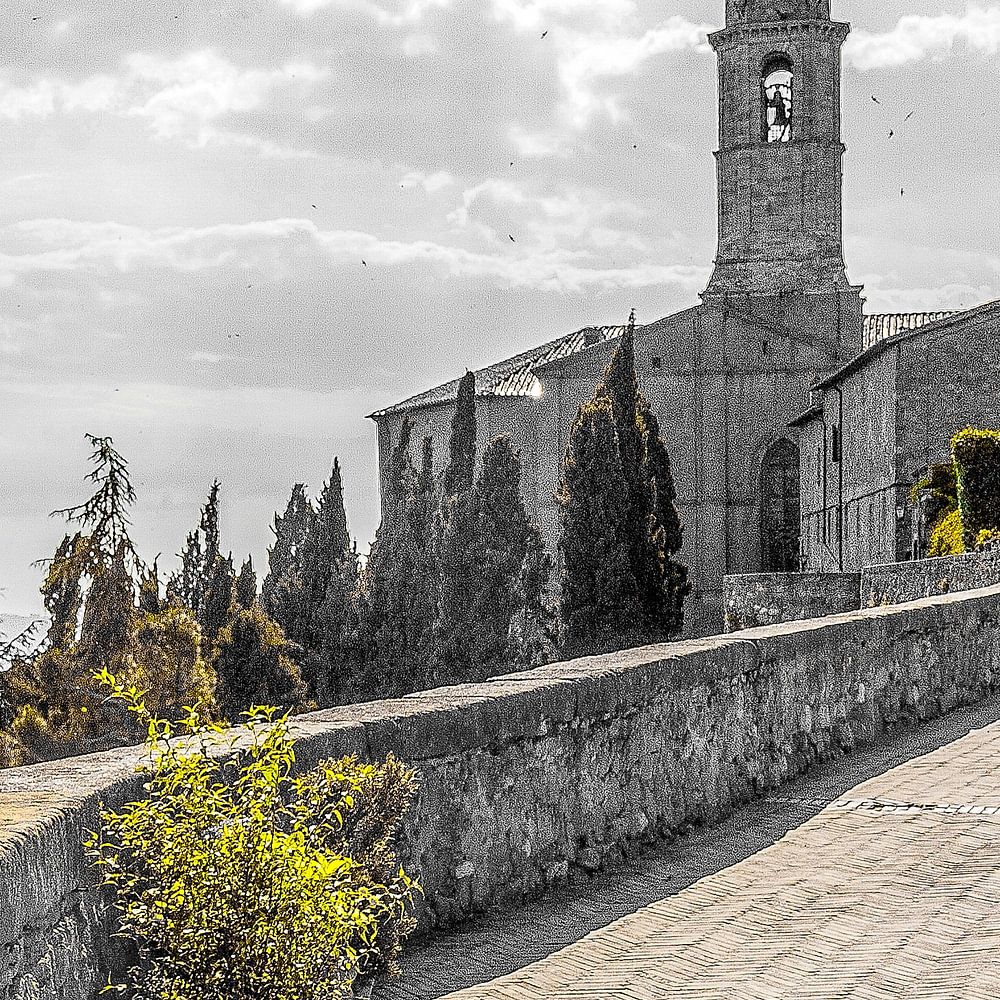De foto is genomen vanaf het ommuurde straatje (Via del Casello) en toont ons de torenspits van de kathedraal, de Duomo di Pienza, gebouwd in de stijl van de renaissance.