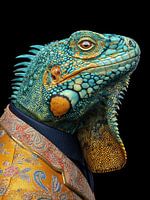 De kleurenharmonie is absoluut verbluffend: de turkooisgroene schubben van de leguaan passen harmonieus bij de gouden tinten van de kimono, terwijl de delicate roze accenten van het borduurwerk een prachtig contrast vormen. Het amberkleurige oog van het reptiel fungeert als een natuurlijk middelpunt en trekt op magische wijze de aandacht.