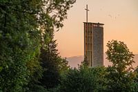 De kerktoren in het avondlicht met een omlijsting door de omringende bomen.
