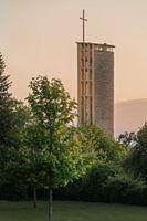 Een kerk gefotografeerd in de avondzon. Een boom staat er in volle glorie voor.
