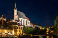 De Katholieke kerk van Sint Vitus in het oude centrum van Český Krumlov, aangelicht op een Zomeravond in 2024. Op de voorgrond stroomt de rivier de Moldau. DezeTsjechische stad in de Bohemen, Krumlau in het Duits, heeft een wereld erfgoed status en wordt dagelijks bezocht door vele toeristen. Deze foto is gemaakt met een Fujifilm x series camera in de Zomer van 2024.