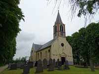De Sint Georgiuskerk in Suawoude ., een prachtig klein kerkje met een specifieke toren met gekleurde steen in een klein dorp in het Friese Tytsjerksteradiel met op de voorgrond de oude begraafplaats die traditioneel rondom de kerk ligt.