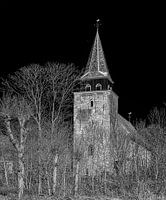 De kerk en kerktoren van het Friese plaatsje Achlum in zwartwit en in de winterperiode zodat het bladerdek van de bomen ervoor nog afwezig is.