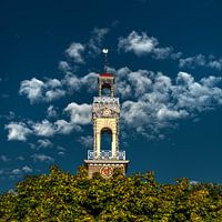 Het eigenzinnige kerktorentje van het Friese plaatsje Arum en het gekleurde zomeravond licht met lichte witte wolkjes op de achtergrond.