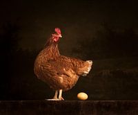 Prachtige leg kip die omkijkt alsof ze denkt "wat heb ik nu weer gelegd?". Een gouden ei.. Gefotografeerd in een klassieke setting met in de achtergrond een boeren tafereel.