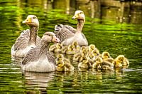 Drie volwassen grauwe ganzen met een klasje van veertien jonge gansjes. Ze zwommen op een mooie dag in het voorjaar van 2018 in een vijver in het Rozenburgpark in Rotterdam-Kralingen. Wat precies de familieverhoudingen waren viel uiteraard moeilijk vast te stellen, maar het lijkt er op dat ganzen wel eens op andergans kinderen passen.