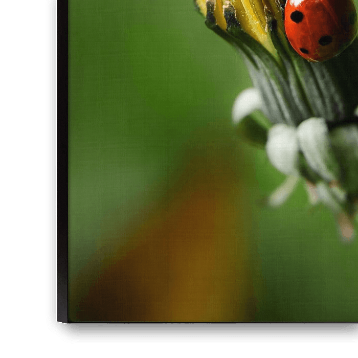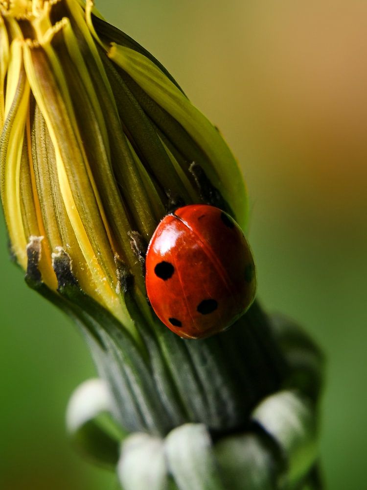 "Herfstlicht op gele bloemen. Een lieveheersbeestje als boodschapper van het kleine geluk."