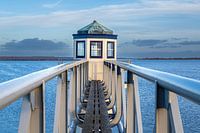 Een foto van een smalle, verweerde pier die uitsteekt in een uitgestrekte, kalme blauwe zee. De metalen relingen van de pier, wit geverfd, lopen over in een klein, vierkant, wit gebouw met een groen koepeldak. Het gebouw heeft een blauwe rand en grote, reflecterende ramen. De lucht erboven is zachtblauw met verspreide, dunne wolken. De horizon is ver weg en loopt over in de zee. De foto wekt een serene, eenzame sfeer.