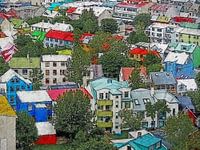 Alsof ze de niet altijd even vrolijke weersomstandigheden willen compenseren, verven de IJslanders de golfplaten van hun huizen in alle kleuren van de regenboog. Beperkende regelgeving lijkt niet te bestaan; tot wat voor een uniek stadspalet dat leidt toont dit beeld gezien vanaf de Hallgrimskirkja. Het centrum van Reykjavik is waarschijnlijk ook de enige plaats in IJsland waar de bomen zo hoog worden.