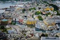 Luchtopname van de kleurrijke huizen in Art Nouveau architectuur, gelegen op enkele eilanden in de stad Ålesund aan de Westkust van Noorwegen in de regio Møre og Romsdal, gezien vanaf de berg Aksla.