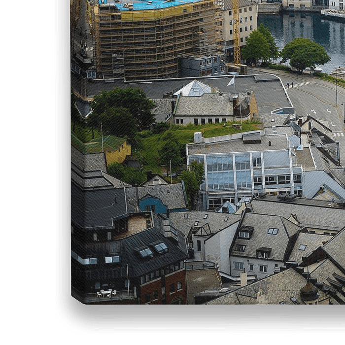 Luchtopname van de kleurrijke huizen in Art Nouveau architectuur, gelegen op enkele eilanden in de stad Ålesund aan de Westkust van Noorwegen in de regio Møre og Romsdal, gezien vanaf de berg Aksla.