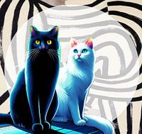 Ben je op zoek naar een vrolijk en kleurrijk schilderij voor je huis? Dan is dit kattenschilderij van Nicole Habets iets voor jou! Dit schilderij toont een groep katten in verschillende technieken en stijlen, met een warme rode en oranje achtergrond. De katten hebben elk hun eigen karakter en uitstraling, en zullen je elke dag een glimlach bezorgen