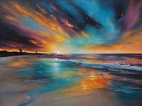 Beleef de betovering van een romantische zonsondergang met dit prachtige schilderij, digitaal gecreëerd met de rijke textuur van olieverf in een impasto techniek. Dit kunstwerk vangt de serene en magische sfeer van een zonsondergang, met zachte kleurovergangen die de lucht en het landschap verlichten in een harmonieuze dans van warme tinten.