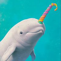 Deze charmante walrusachtige vriend zwemt met een vrolijke glimlach door de zachte golven. Een spiraalvormige, kleurrijk gestreepte "eenhoorn" hoorn siert zijn voorhoofd en geeft hem een magisch tintje. De heldere kleuren tegen de aquatische achtergrond nodigen je uit voor een vermakelijk avontuur in de fantasiewereld.