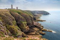 Prachtige opname van de vuurtoren bij Cap Frehel, aan de smaragdkust van Bretagne, Frankrijk, met steile klif en kustlijn in de zomer