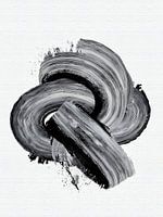 Een abstracte compositie van zwarte en grijze penseelstreken, die een gevoel van beweging en diepte creëert op een witte achtergrond