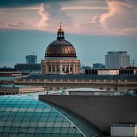 Boven de daken van Berlijn, een blik op de koepel van het Berlijnse Humboldt Forum tijdens zonsondergang.
