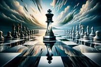 Het kunstwerk toont een indrukwekkende scène van een schaakspel waarin de koningin, een dominante figuur, zich in het midden van het gezichtsveld bevindt. Ze stijgt majestueus de lucht in, weerspiegeld in het spiegelgladde schaakbord, dat de scheidslijn vormt tussen het majestueuze natuurlijke schouwspel op de achtergrond en het…