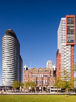De ondergaande zon schijnt op de Kop van zuid met het Port of Rotterdam gebouw, Hotel New York en het Montevideo gebouw.