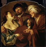 Groep van drie personen: rechts een koppelaarster, in het midden een jonge man met een geldstuk en links een lachende jonge vrouw met een luit.