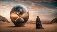 In het midden van een eindeloos woestijnlandschap rijst een gigantische, glazen zandloper op die eruitziet als een monument voor de tijd. Het oppervlak is onberispelijk, een mengeling van transparantie en glinsterende reflectie die de delicate kleuren van de opkomende zon vangt. Een universum wervelt in de zandloper, een levend spektakel van sterrennevels, sterrenstelsels en fonkelende lichtpuntjes die het grenzeloze universum symboliseren. Het zand druppelt langzaam, bijna tastbaar, alsof de tijd zelf een moment heeft gevonden om op adem te komen.