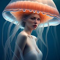Dit serene kunstwerk vangt een moment van betovering waarin de vrouw en de oceaan één lijken te zijn. In het centrum van de compositie staat de vrouw, haar uitstraling van vrede en harmonie in perfecte balans met de omgeving. Op haar hoofd rust een prachtige kwal, stralend in tinten van oranje, wit en transparant, als een levend juweel van de zee.