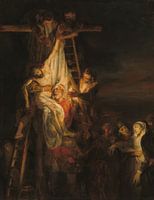 Het levenloze lichaam van een bebaarde jongeman, gedeeltelijk gewikkeld in een ivoren doek, wordt in dit verticale schilderij van een kruis naar een groep mensen aan de voet ervan neergelaten. Alle mensen hebben een perzikkleurige of bleke huid en de meesten zijn gekleed in crèmewit en tinten bruin. Het lichaam en hoofd van de dode man, Jezus, zakken naar links van ons, met gesloten ogen en open mond. Zijn armen en handen zijn rood gestreept en druppels bloed stippelen zijn hoofd. Twee mannen op ladders die tegen de achterkant van het kruis staan, reiken over de bovenste dwarsbalk en een man aan onze rechterkant houdt Jezus' linker pols vast. Een lange witte doek is over de dwarsbalk gedrapeerd en valt om Jezus' heupen. Twee andere mannen staan op de ladders aan weerszijden van het kruis, een met zijn arm om Jezus' torso terwijl de ander naar voren reikt om een fakkel vast te houden die de groep lichamen dramatisch verlicht. Een oudere man met wit haar en baard, gekleed in een scharlakenrode tuniek, staat vooraan en wiegt de heupen en benen van Jezus terwijl hij wordt neergelaten. Zes mensen staan rechts van de oude man en het kruis. Een fel licht valt op het gezicht van een bleke, oudere vrouw. Haar ogen zijn gesloten, haar mond open en haar armen slap terwijl ze wordt gevangen door de mensen om haar heen. De mannen in de groep dragen hoeden en de hoofden van de vrouwen zijn bedekt met sjaals. Vanuit de schaduwen links van het kruis, vlak bij de rand van het schilderij, tuurt het bleke gezicht van een vrouw naar het tafereel. Het landschap achter het kruis en de groep is diep in de schaduw, maar roestbruine strepen vormen de horizon in de verte.