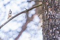 De kuifmees is een typische bosvogel die onder andere voorkomt in de bossen op de Veluwe. Deze foto is gemaakt op de Veluwezoom. De kuifmees is alert en heeft zijn kuif recht omhoog staan. Het is een druk vogeltje wat behoort tot de mezen. Ze komen vooral voor in dennenbossen voor waar ze de zaden uit de kegels peuteren.