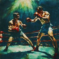 Het schilderij barst van het leven en vangt de rauwe intensiteit van twee boksers die in een fel gevecht verwikkeld zijn. Dynamische penseelstreken vegen over het doek en roepen een vlaag van beweging op die de kijker meesleept in het hart van de actie. Contrasterende lichte en donkere tinten spelen tegen elkaar, waardoor het zweet op de lichamen van de boksers en de vastberaden uitdrukkingen op hun gezichten worden benadrukt.