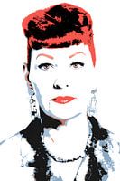 Een minimalistisch popartportret toont een vrouw met strak gestyled, felrood haar, een bleke huid en duidelijk geaccentueerde lippen. Het kleurenpalet is sterk contrastrijk: wit, zwart, rood en koele blauwtinten domineren. Sieraden en kleding worden slechts gesuggereerd, maar komen elegant en grafisch over. Haar blik is rustig, beheerst…