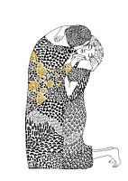 Een herinterpretatie van Klimts 'De kus' toont het iconische paar in een omhelzing, afgebeeld met opvallende contrasten die de gedetailleerde patronen van hun kleding benadrukken. De afwezigheid van kleur versterkt de emotionele intensiteit en nodigt kijkers uit om een nieuw perspectief op Klimts tijdloze beelden te verkennen.