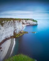 Étretat, rotsachtige klif en strand. Foto met lange belichting. Luchtfoto. Normandië, Frankrijk.