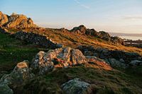 Deze landschapsfoto is gemaakt tijdens het zogenaamde 'gouden uur', wat zeer warme tinten en lange schaduwen geeft, terwijl de lucht gevuld is met pastelkleuren. Typisch zijn de muurtjes van rotsblokken die als erfafscheiding door het landschap slingeren, waarbij aansluiting wordt gezocht bij bestaande rotsformaties. Schilderachtig en duurzaam.