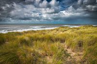 Een landschapsbeeld van de Hollandse kustlijn is rijk aan contrasten. De duinen, begroeid met helmgras, vormen een natuurlijke buffer tussen land en zee. De Noordzee rolt krachtig aan, met schuimende golven die een spel spelen met het zand. Boven dit dynamische tafereel hangt een dreigende wolkenlucht, waar donkere en lichte tinten…