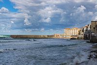 De kustlijn bij Cefalu op het italiaanse eiland Sicilië. Het zonlicht schijnt mooi op de huizen.