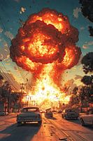 Een eenzame auto rijdt over een verlaten weg terwijl een enorme explosie de horizon verteert. Dit filmische meesterwerk vangt de rauwe intensiteit van de vernietiging, afgewisseld met de angstaanjagende kalmte van de reis van één enkel voertuig door de chaos. De vurige uitbarsting verlicht de scène met adembenemende details en roept thema's op als veerkracht en het menselijk instinct om tegen alle verwachtingen in te ontsnappen. Een visueel verhaal van adrenaline en wanhoop verpakt in apocalyptische schoonheid.