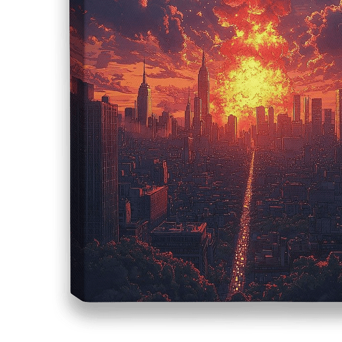 Een eenzame auto rijdt over een verlaten weg terwijl een enorme explosie de horizon verteert. Dit filmische meesterwerk vangt de rauwe intensiteit van de vernietiging, afgewisseld met de angstaanjagende kalmte van de reis van één enkel voertuig door de chaos. De vurige uitbarsting verlicht de scène met adembenemende details en roept…