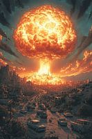 Een eenzame auto rijdt over een verlaten weg terwijl een enorme explosie de horizon verteert. Dit filmische meesterwerk vangt de rauwe intensiteit van de vernietiging, afgewisseld met de angstaanjagende kalmte van de reis van één enkel voertuig door de chaos. De vurige uitbarsting verlicht de scène met adembenemende details en roept thema's op als veerkracht en het menselijk instinct om tegen alle verwachtingen in te ontsnappen. Een visueel verhaal van adrenaline en wanhoop verpakt in apocalyptische schoonheid.