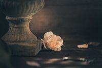 Aan de voet van de vaas ligt een laatste vergeten rozenbloesem. De klimroos Mme Alfred Carrière werd in 1879 gefokt. De bloemen hebben een onbeschrijflijk mooie, fruitige en lichte geur.